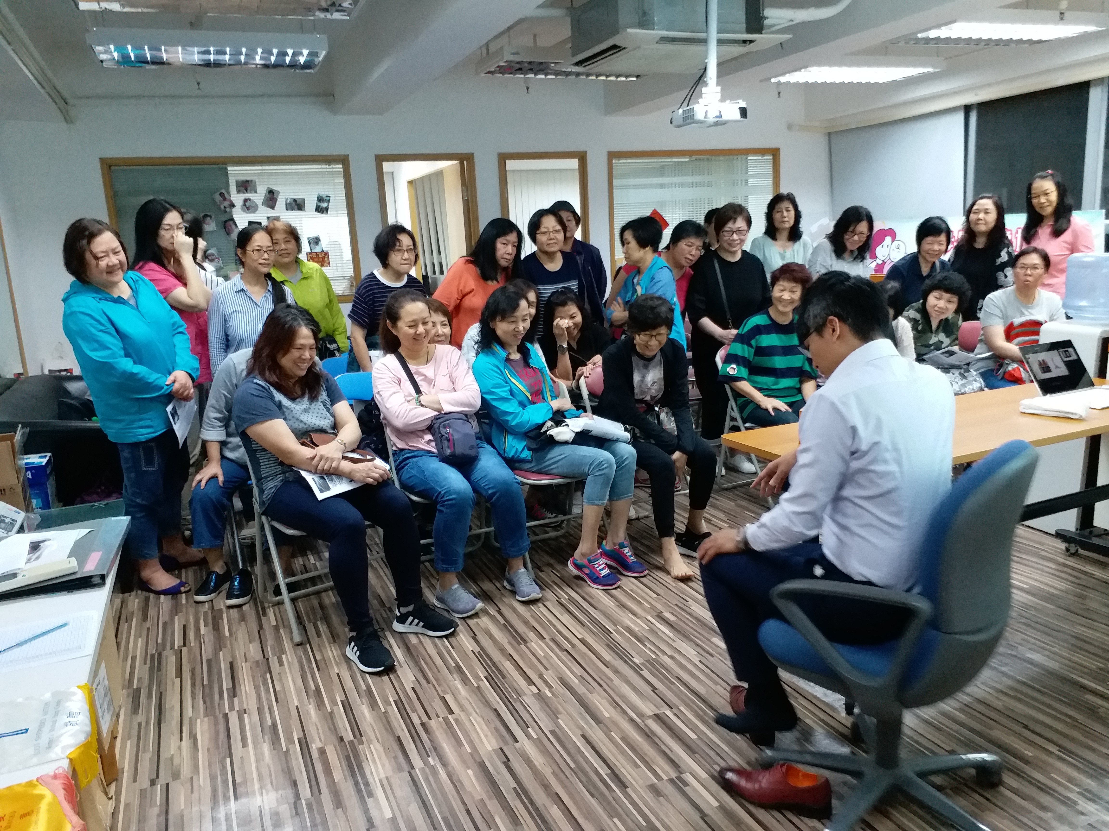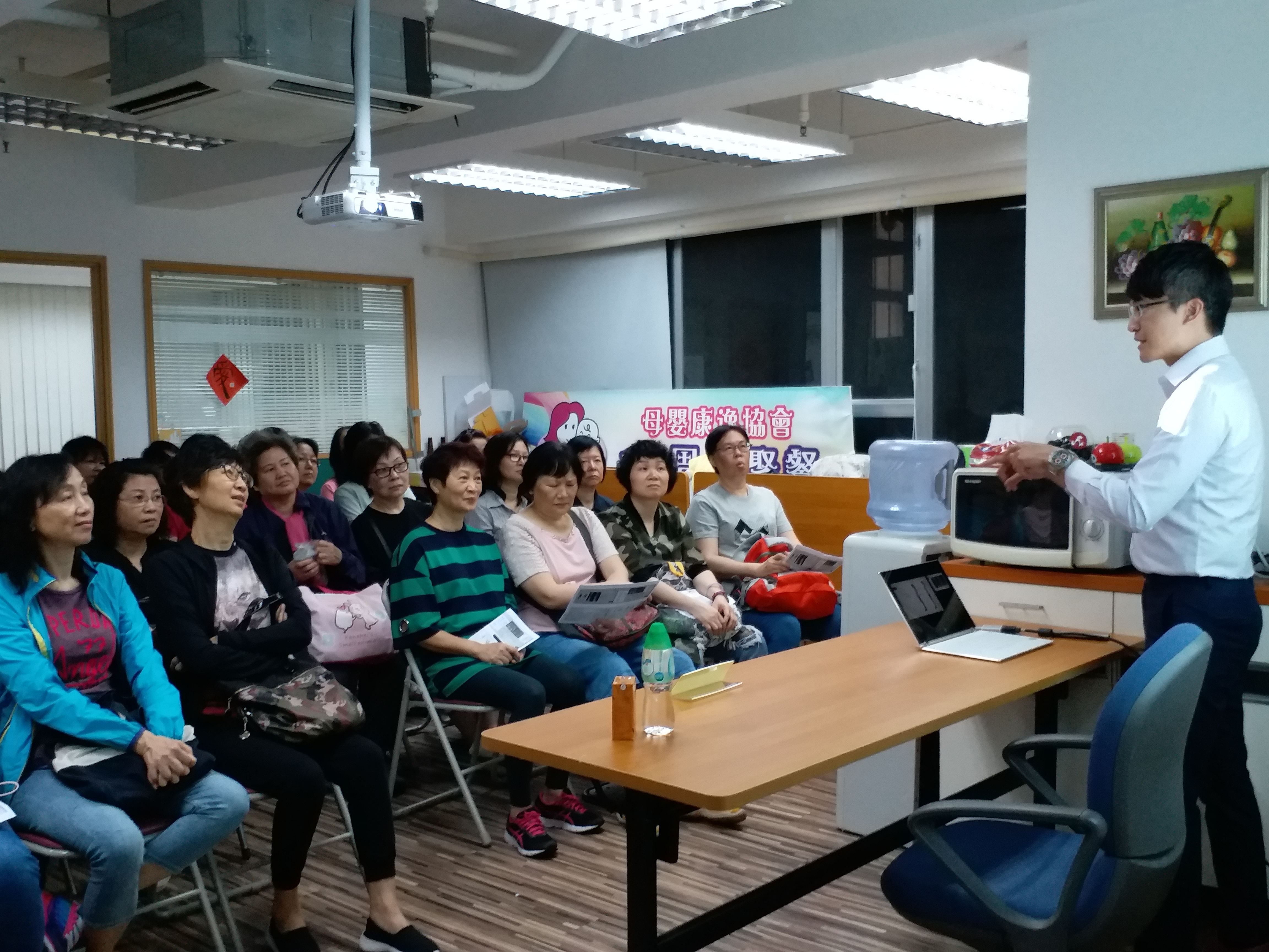 是次講座註冊物理治療師 - 周志發先生講解了預防及舒緩痛症的方法,尤其是針對我們陪月員日常工作而產生的痛症,如正確的擰毛巾方法、抱嬰兒姿勢等,周先生生動的講解和即場示範使陪月員獲益良多。