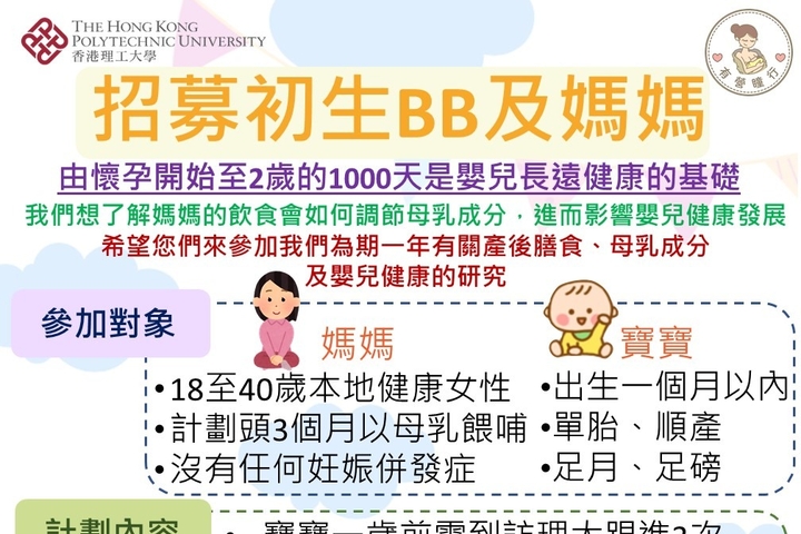關於哺乳媽媽飲食、母乳成分、嬰兒腸道微生物群和發育之間關聯的研究 <香港理工大學>