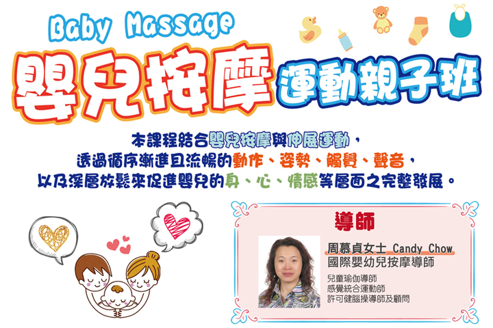 嬰兒按摩運動親子班 (BB Massage) 由國際嬰幼兒按摩導師教授,適合3-8個月幼兒及家長一起參加。