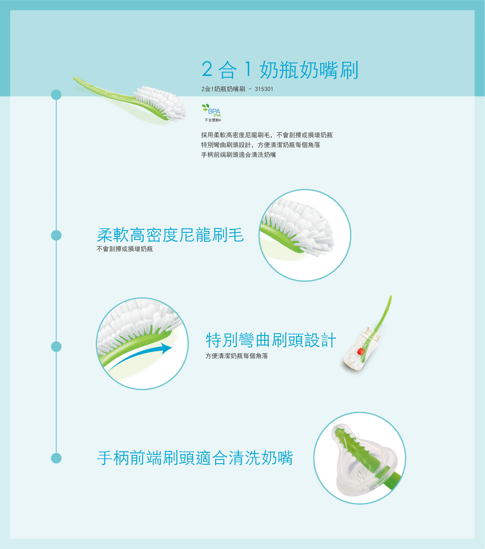 特別彎曲刷頭設計,方便清潔奶瓶底部