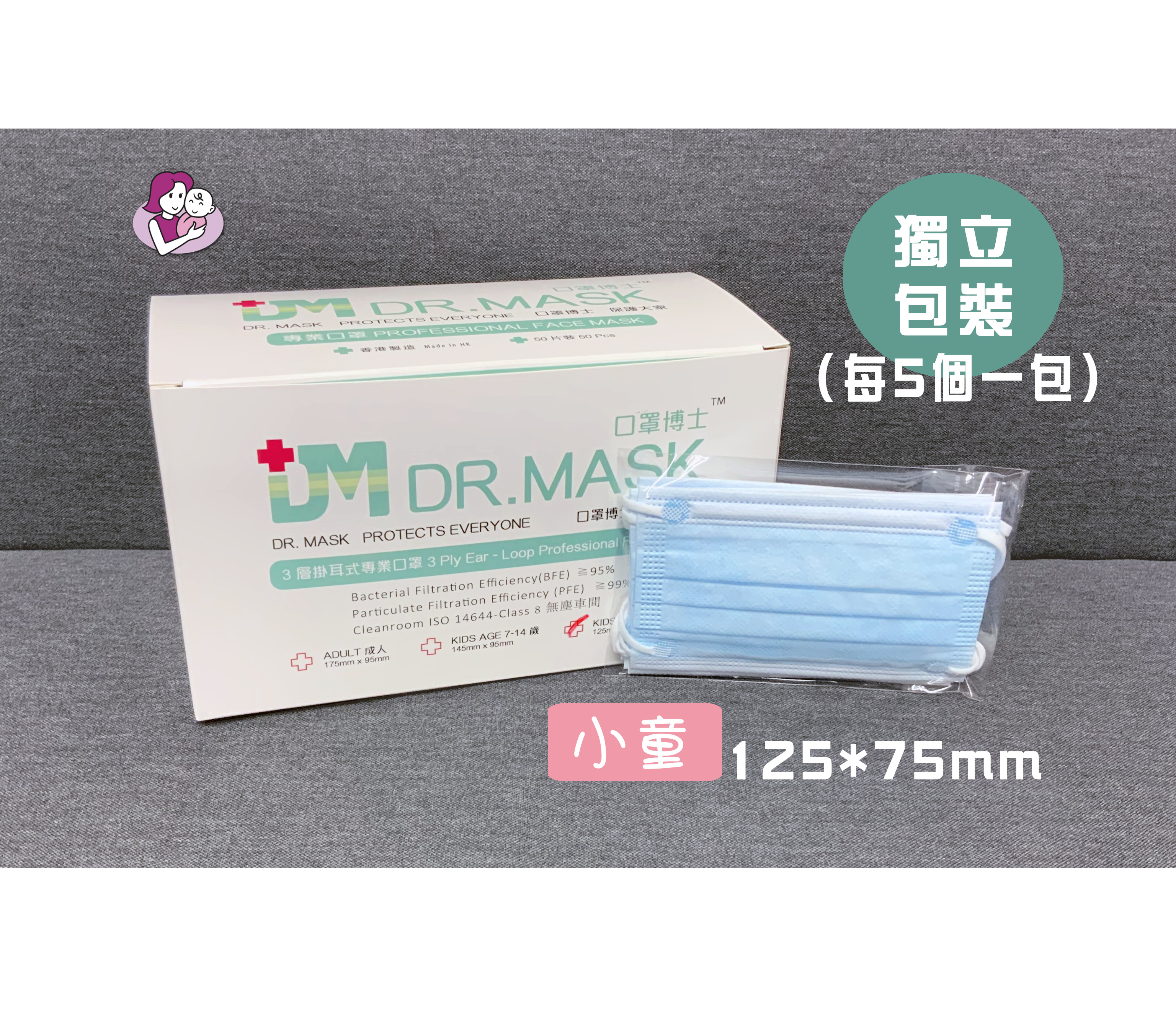 小童裝 - Dr. Mask囗罩博士 三層掛耳式囗罩(5個一包獨立包裝,香港製造)