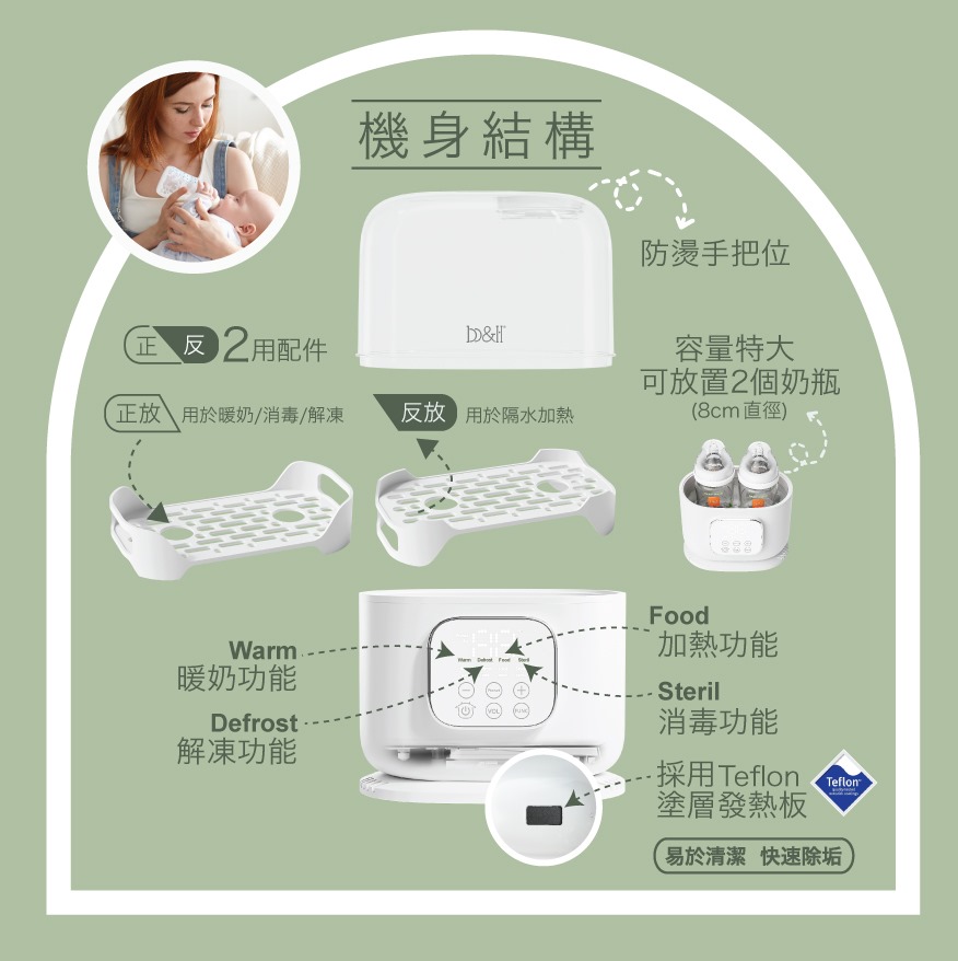 - 5合1功能: 暖奶、解凍、熱食、消毒、預設時間