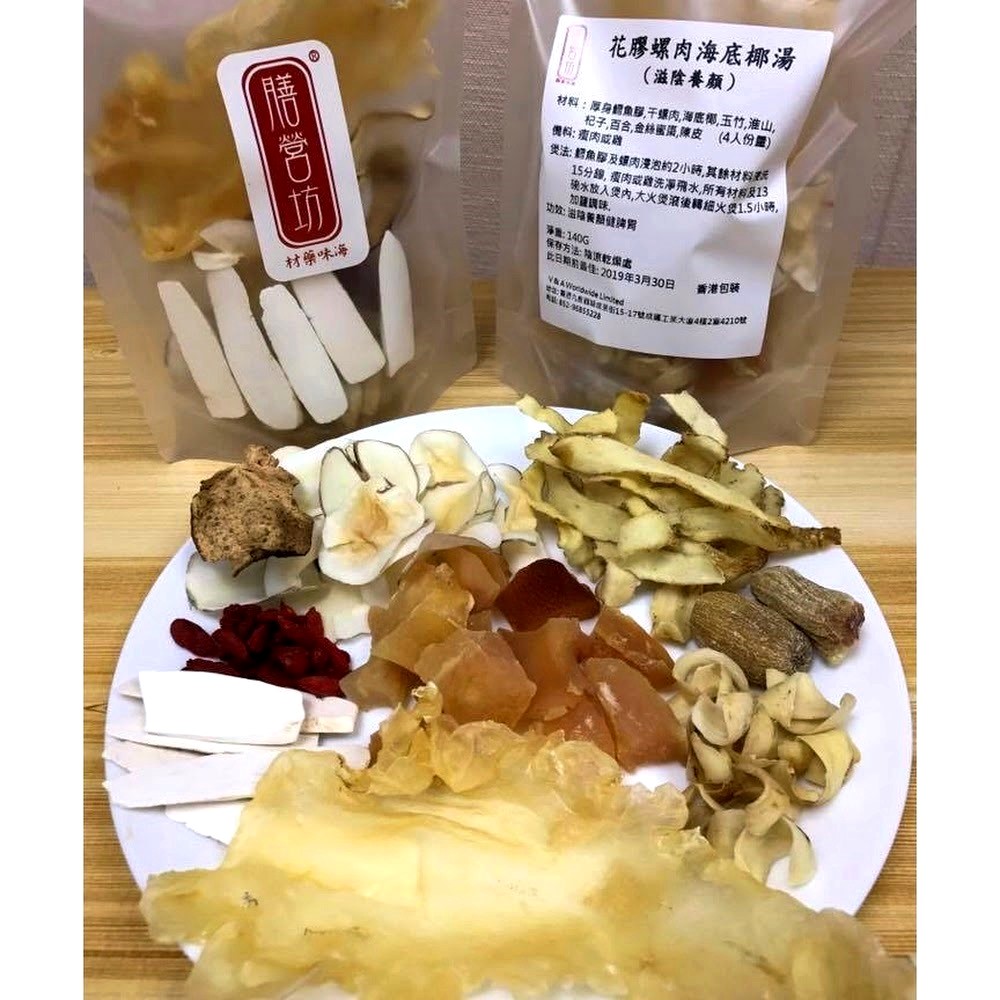 鱈魚膠及螺肉浸泡約2小時,其餘材料浸洗15分鐘,瘦肉或雞洗淨飛水,所有材料及13碗水放入煲內,大火煲滾後轉細火煲1.5小時,加鹽調味
