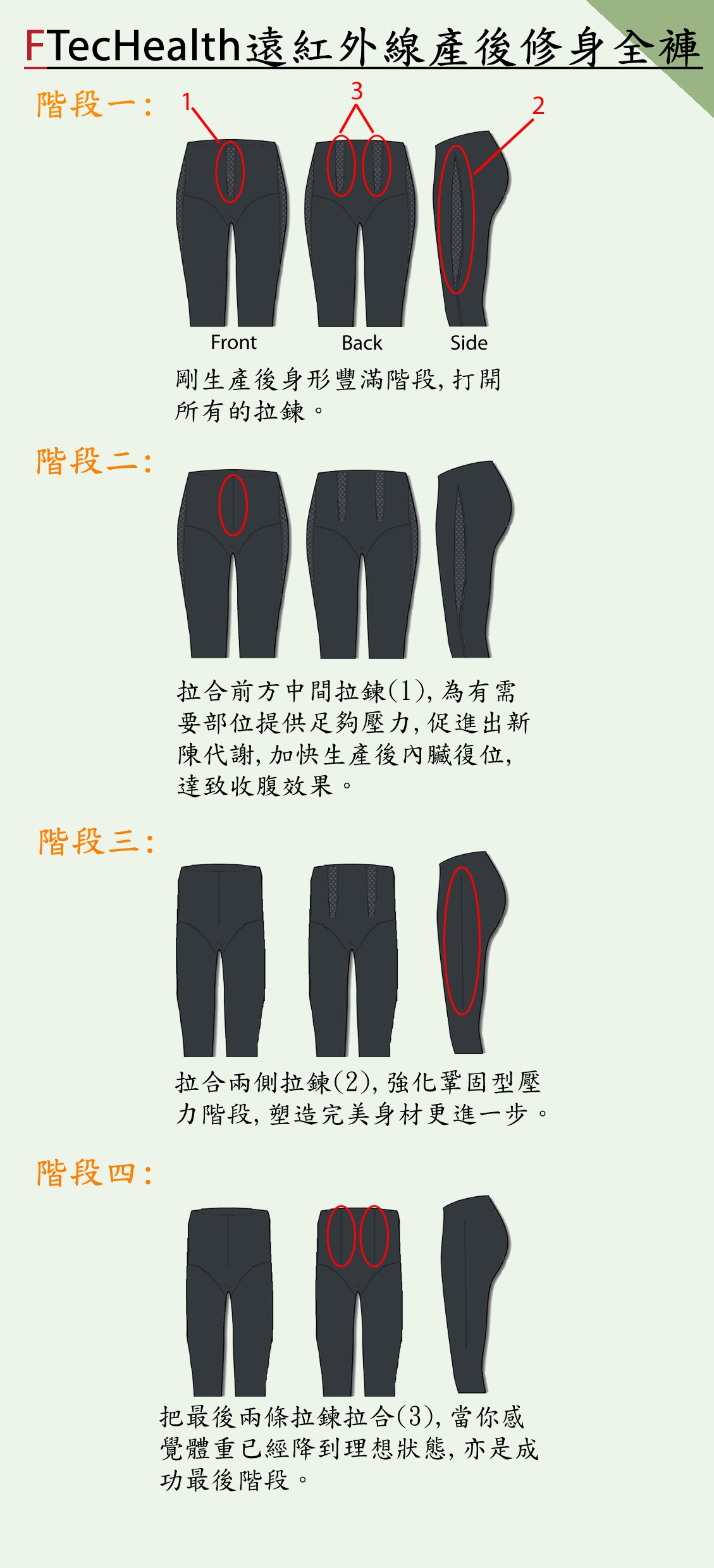 階段二:拉合前方中間一條拉鍊,為有需要部位提供足夠壓力,促進新陳代謝,達致收腹效果。